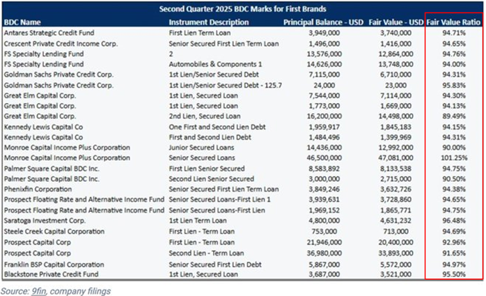 Come accennato nella sideview di un anno fa, il problema non è nuovo. Allora parlavamo del rischio di un mercato “protetto dal velo del mark-to-model”, dove il valore di un prestito nasce più da calcoli e ipotesi che vanno ad alimentare fogli di calcolo piuttosto che da un mercato trasparente basato su domanda e offerta. Per capire quanto questo tema resti attuale, abbiamo cercato evidenze di come i principali fondi di private credit valutassero la loro esposizione a First Brands. La tabella qui sotto mostra i dati più recenti: quasi tutte le BDC continuano a segnare i prestiti a valori superiori al 90% del nominale, nonostante il fallimento della società e l’apertura di un’indagine federale. Un esercizio contabile che, più che riflettere la realtà, sembra confermare quanto scrivevamo allora: nel credito privato, la verità del prezzo arriva sempre per ultima.