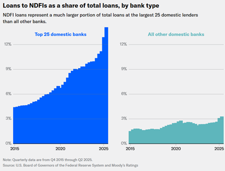 Sempre secondo dati di Moody’s[2], le banche americane hanno ormai prestiti per 1,2 trilioni di dollari verso NDFI, di cui circa 300 miliardi destinati direttamente a fondi di private credit, e altri 285 miliardi a fondi di private equity. In tutto, queste esposizioni rappresentano il 10,4% dei prestiti totali del sistema bancario USA, quasi triplo rispetto al 3,6% di dieci anni fa. Se si aggiungono i 340 miliardi di linee di credito non ancora utilizzate, il conto sfiora 1,5 trilioni di dollari di finanziamenti potenziali, un volume paragonabile all’intero PIL dell’Australia. Moody’s sottolinea che questa crescita è stata trainata in larga parte dai 25 maggiori istituti statunitensi, da JPMorgan a Bank of America fino a Goldman Sachs, che concentrano la quasi totalità dei 1,2 trilioni di dollari di prestiti alle NDFI.
