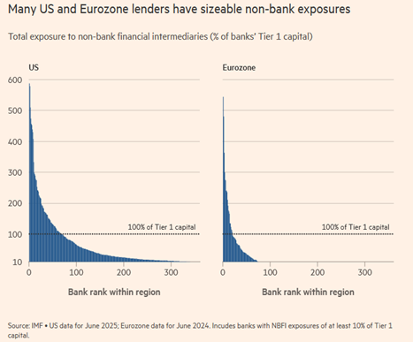 Il grafico elaborato dal Financial Times con i dati del FMI e rimostra bene la sproporzione: sia negli Stati Uniti che nell’Eurozona, una quota significativa di istituti presenta legami con il sistema non bancario tali da eguagliare, o superare, il proprio buffer di capitale primario. Il rischio non è solo quantitativo, ma qualitativo. Oggi oltre il 40% degli attivi bancari globali proviene da istituti che hanno esposizioni verso soggetti non bancari superiori al proprio capitale di vigilanza. La ragione, come detto in precedenza, è che questi prestiti garantiscono rendimenti sul capitale (ROE) più elevati rispetto al credito commerciale tradizionale, grazie a requisiti patrimoniali più leggeri.