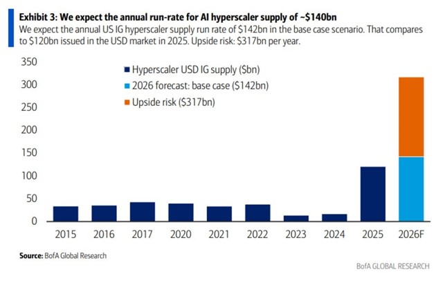 Le grandi aziende tecnologiche hanno emesso un record di 120 miliardi di dollari di debito corporate nel 2025 per finanziare investimenti AI, con un aumento del 500% rispetto al 2024. Nel 2026 si prevede un ulteriore +18%, portando il totale a 142 miliardi nello scenario base.