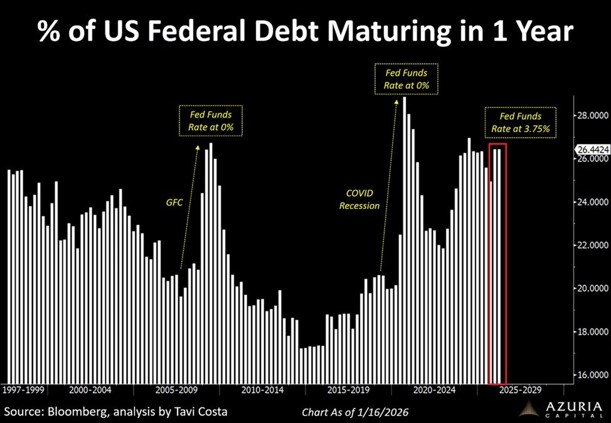 La situazione del debito americano si fa critica: circa il 26% del debito federale è in scadenza nei prossimi 12 mesi. A differenza dei picchi precedenti (2009 e 2020), quando i tassi erano a zero, oggi sono al 3,75%. Circa 10 trilioni dovranno essere rifinanziati.