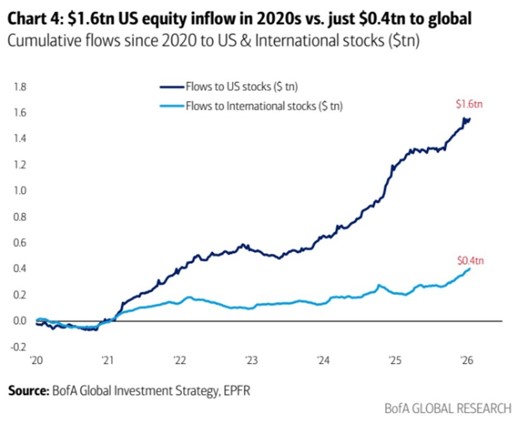 Il mercato azionario americano non è mai stato così dominante: dal 2020, le azioni USA hanno attratto flussi netti per 1,6 trilioni di dollari, quattro volte superiori ai 400 miliardi confluiti nelle azioni internazionali.