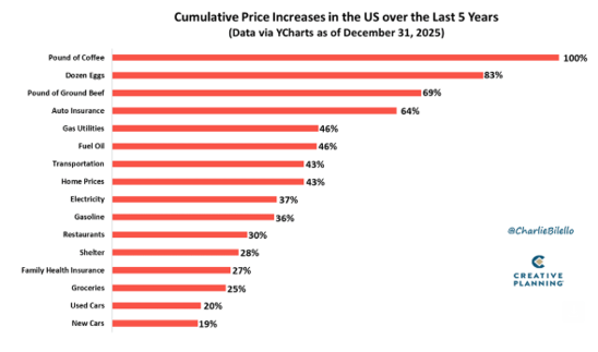 L’inflazione americana (CPI) ha chiuso il 2025 al 2,7% a/a, il 58esimo mese consecutivo sopra il target del 2% della Fed. Mentre i dati ufficiali riportano un’inflazione sotto il 3%, i prezzi dei principali beni di consumo delle famiglie americane come caffè, uova e assicurazione auto sono aumentati tra il 70% e il 100% negli ultimi 5 anni.