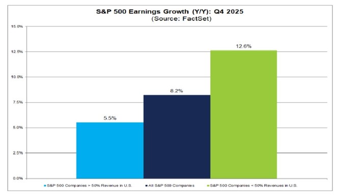 Nel Q4 2025, le società dell’S&P 500 con una maggiore esposizione ai ricavi esteri hanno registrato una crescita degli utili superiore rispetto a quelle più focalizzate sul mercato domestico. La svalutazione del dollaro durante il 2025 ha reso i beni e i servizi statunitensi più competitivi sui mercati internazionali, sostenendo volumi e pricing per le aziende con una base di ricavi più globale.