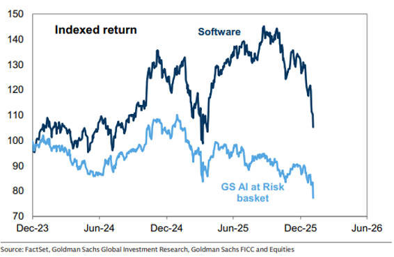 I titoli software sembrano essere finiti nell’occhio del ciclone, con il mercato che sta prezzando il timore che l’AI possa erodere parte dei modelli di business tradizionali. Il grafico di Goldman Sachs mostra come sia il settore software sia il paniere “AI at Risk” abbiano registrato una marcata correzione. La crescente percezione di vulnerabilità all’AI ha alimentato prese di profitto, aumento della volatilità e una più ampia revisione delle valutazioni nel comparto.