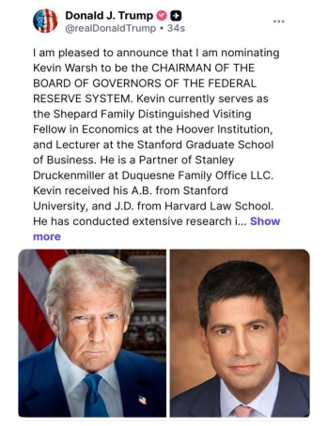 Il Presidente Trump ha annunciato la nomina di Kevin Warsh come nuovo Chairman della Federal Reserve. Warsh è partner di Stanley Druckenmiller presso Duquesne Family Office. Druckenmiller è considerato uno dei migliori investitori della storia recente, con rendimenti medi del 30% annuo senza maix\ un anno in perdita, ed è stato mentore di Scott Bessexnt. La filosofia economica di Warsh è influenzata dal pensiero di Milton Friedman, economista premio Nobel celebre per la teoria secondo cui “l’inflazione è sempre e ovunque un fenomeno monetario“.